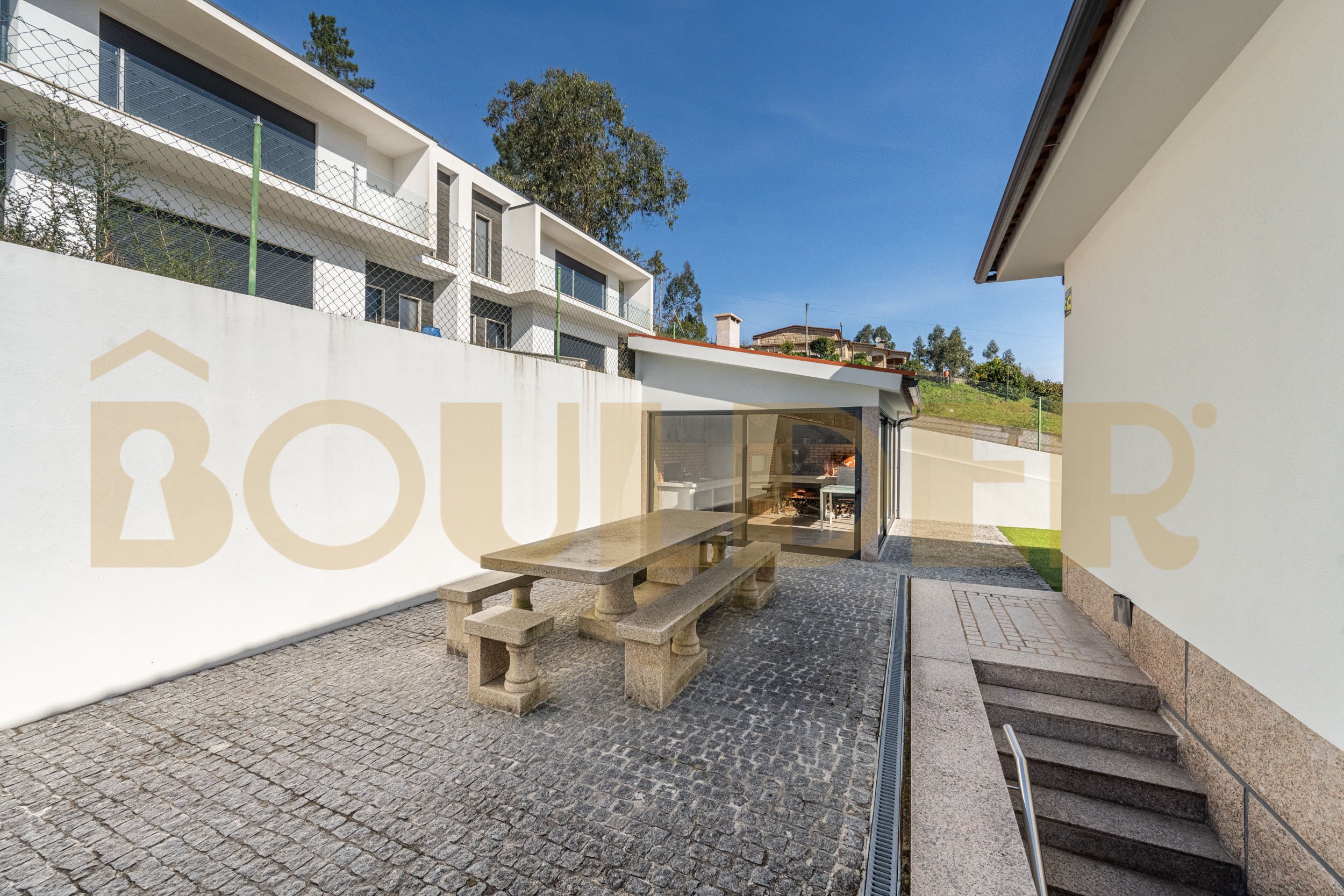- Ampla zona de lazer com mesa e bancos em pedra maciça