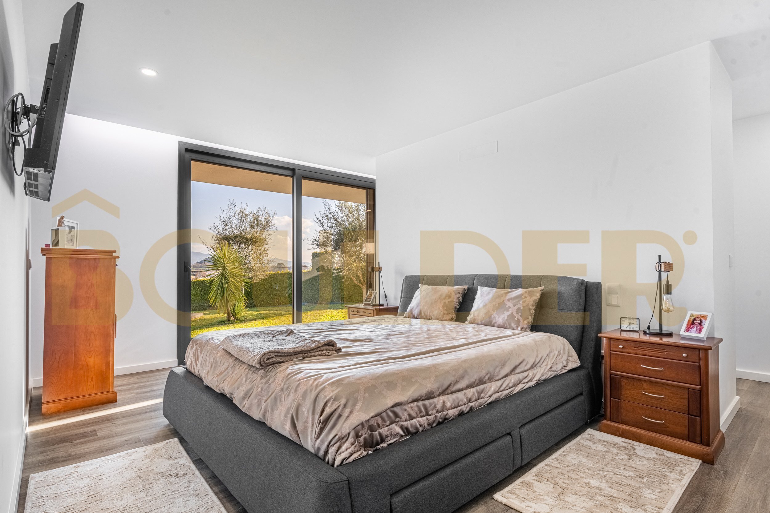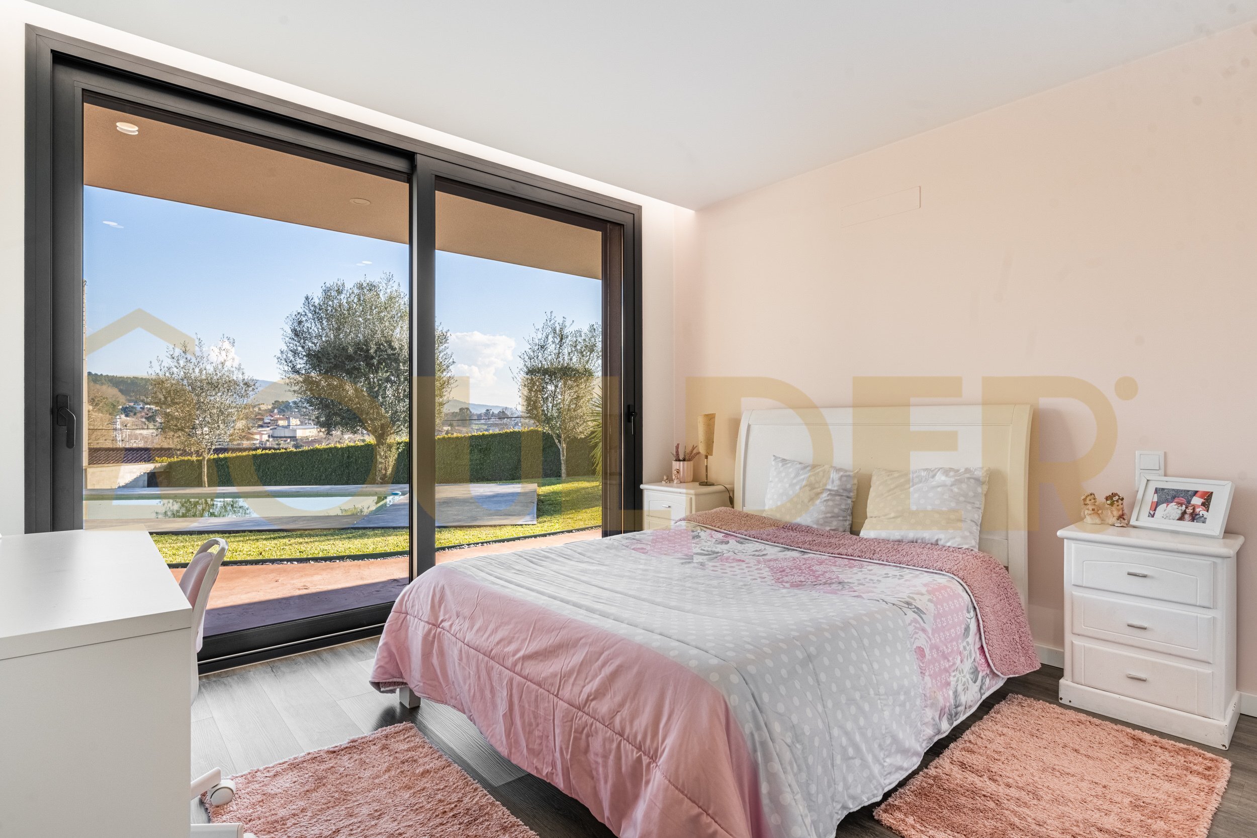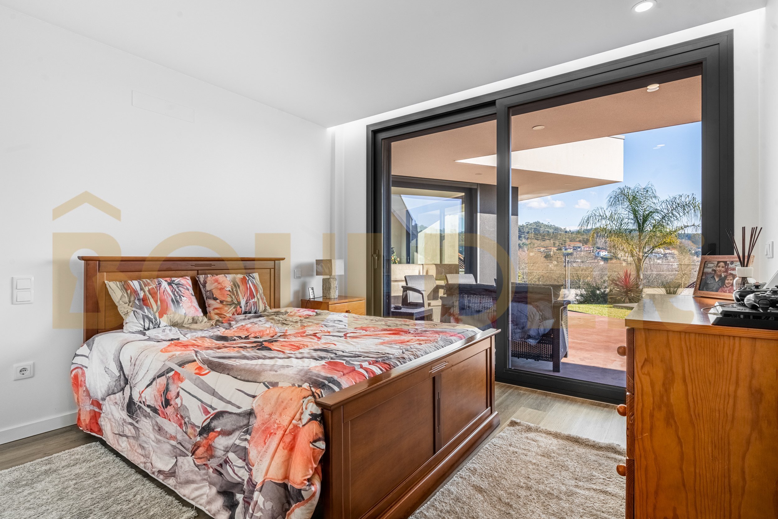 No exterior, a moradia oferece uma zona reservada de lazer, com piscina e churrasqueira, perfeita para desfrutar dos dias de sol e de momentos ao ar livre.