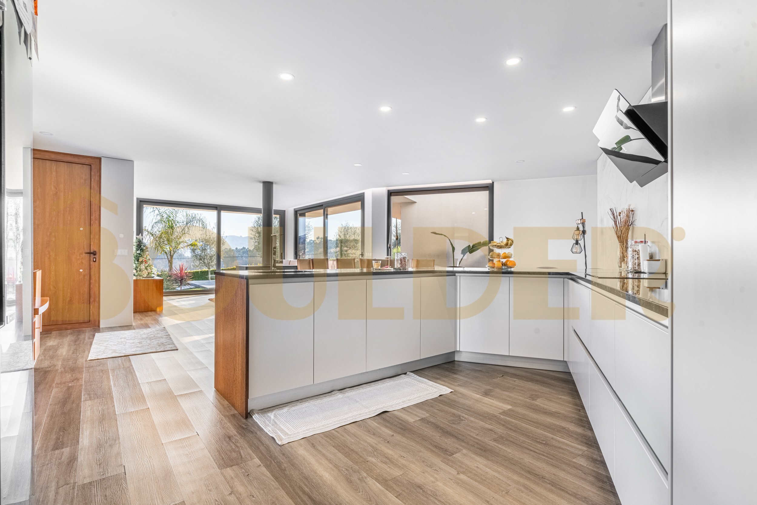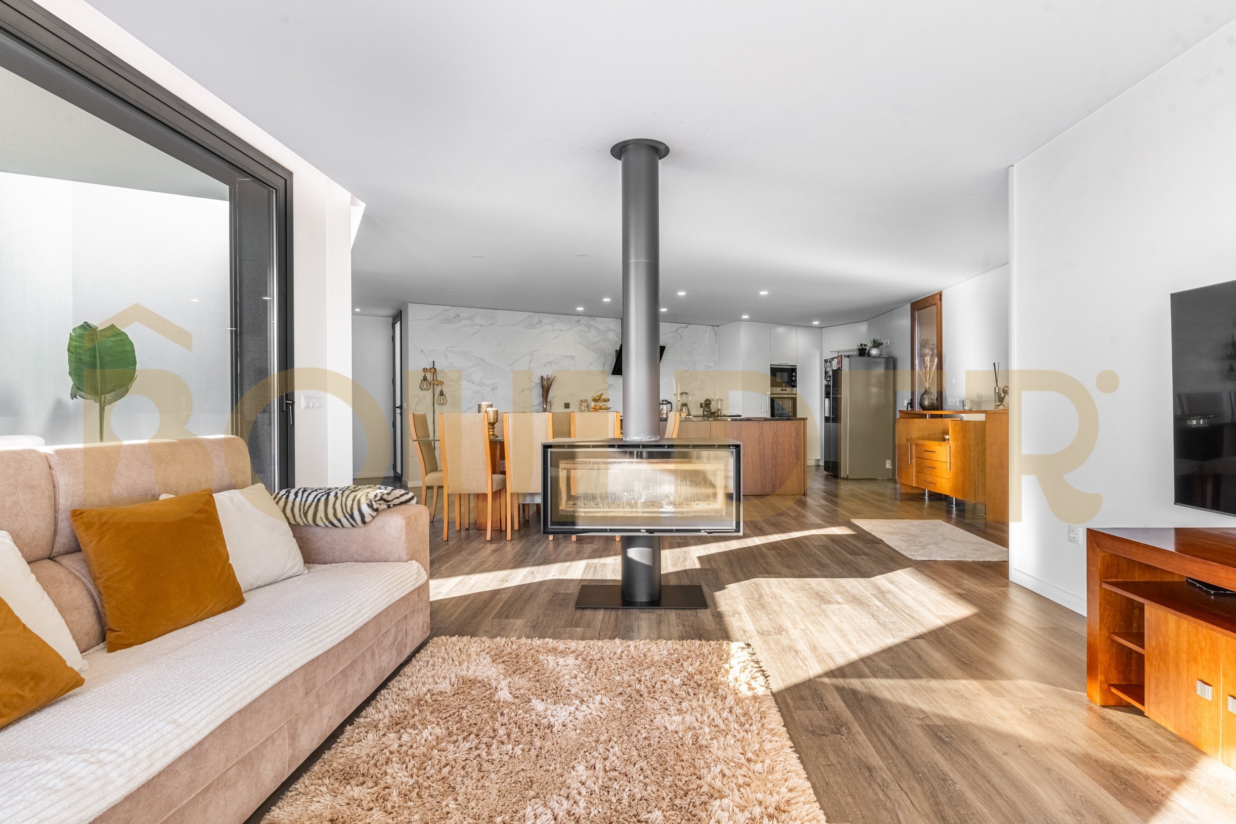 A zona social é composta por uma ampla sala em open space com a cozinha, criando um ambiente moderno e luminoso, ideal para momentos em família ou convívio. A sala dispõe ainda de lareira e pré-instalação de ar condicionado.